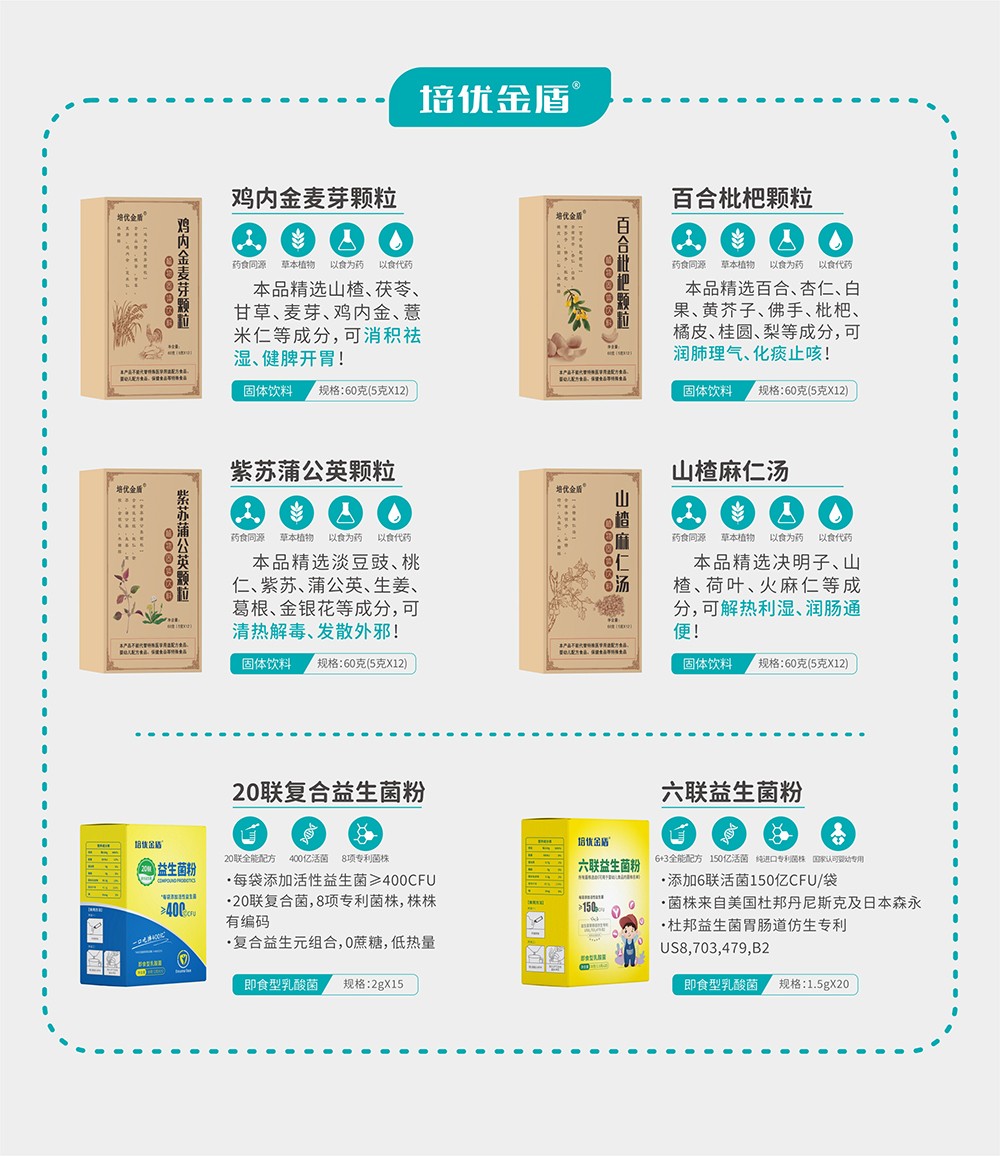 品牌名稱:培優(yōu)金盾 主營產(chǎn)品:培優(yōu)金盾藥食同源顆粒,培優(yōu)金盾益生菌 品牌特色:嚴(yán)格選材 科學(xué)配比