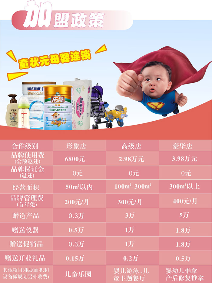 自有工廠,品質(zhì)保障,持續(xù)供貨。千家品牌廠家,直采直供,定位全部顧客群消費(fèi)攀升。目前正面前全國(guó)范圍內(nèi)誠招母嬰人士共同加入童狀元,開啟屬于你的母嬰店。